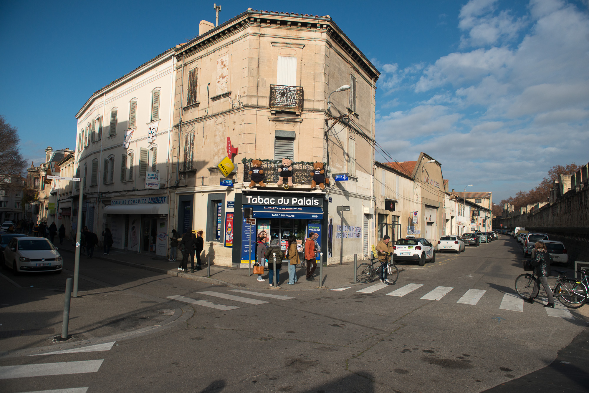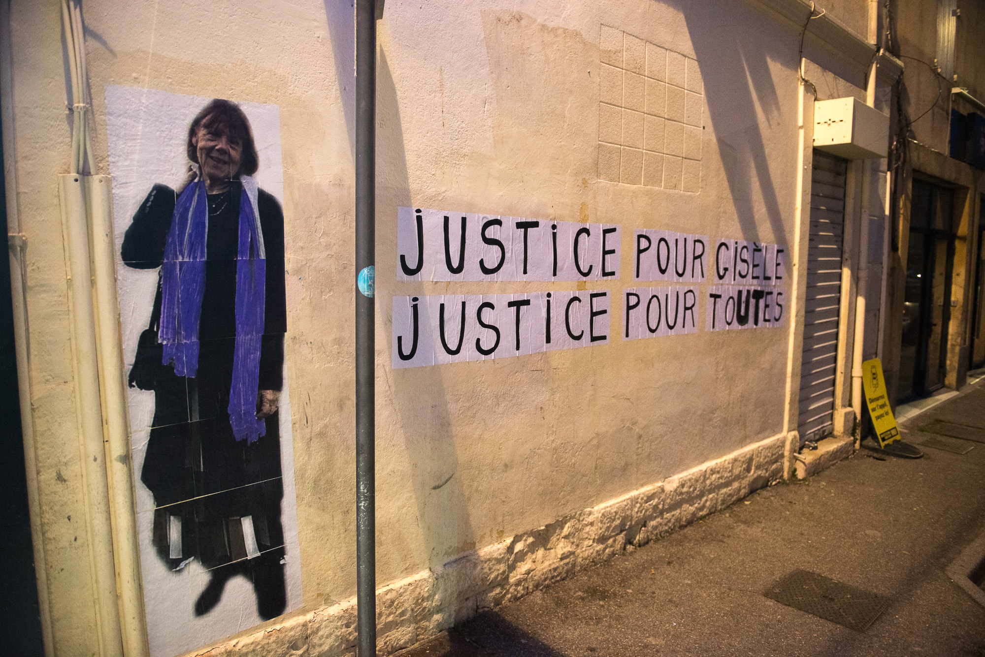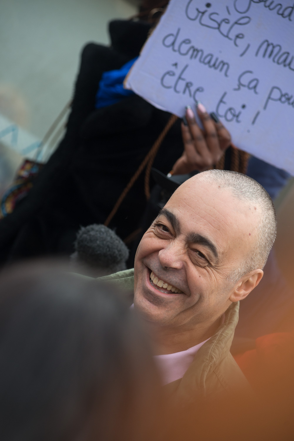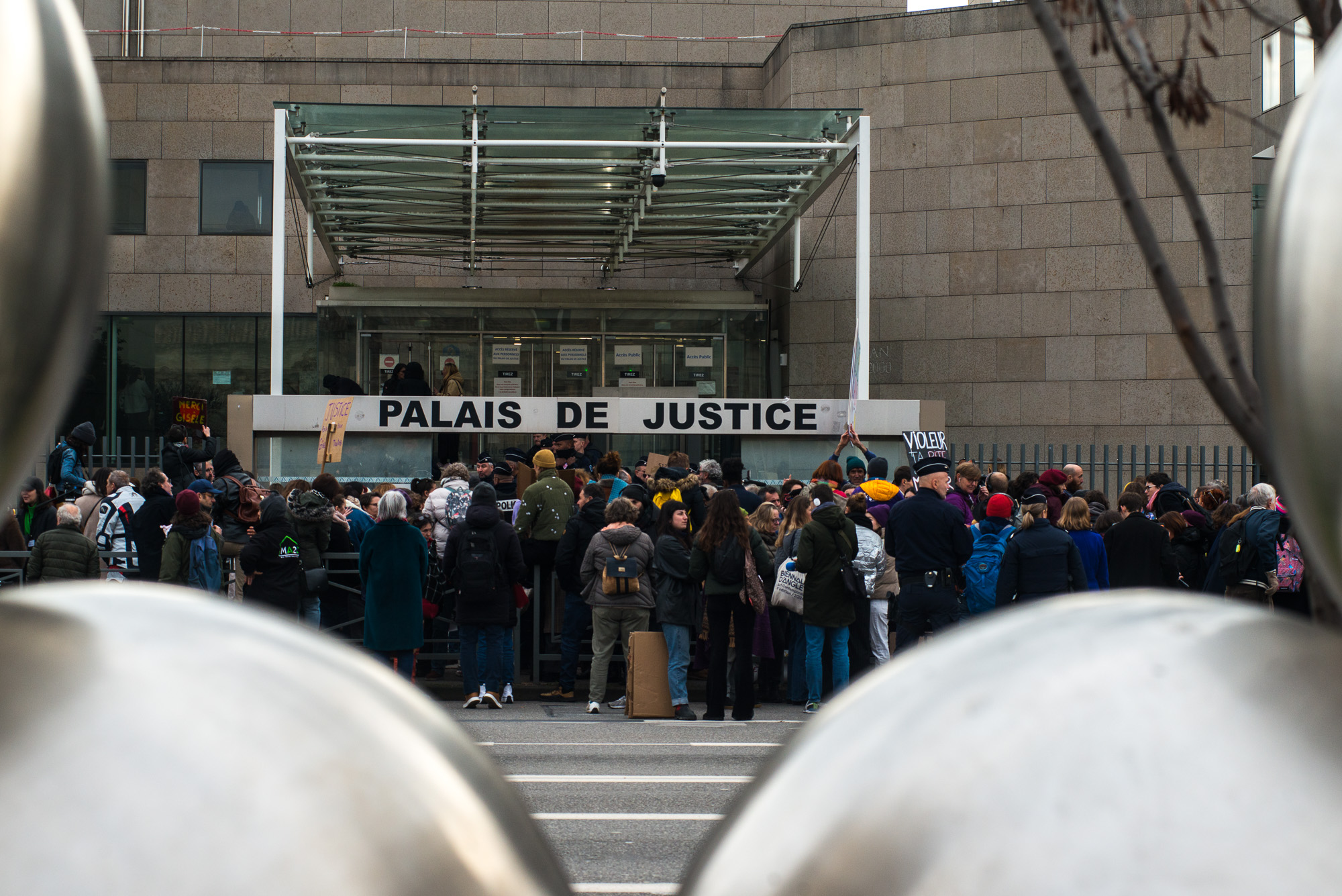 Le matin devant le tribunal d’Avignon. La foule s’agite, des pancartes se dressent, des voix s’élèvent. Les avocats s’animent et les accusés, scrutés, traversant le tumulte.